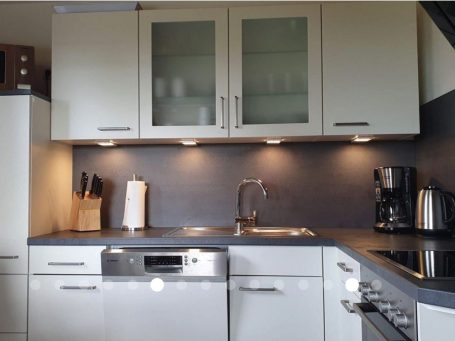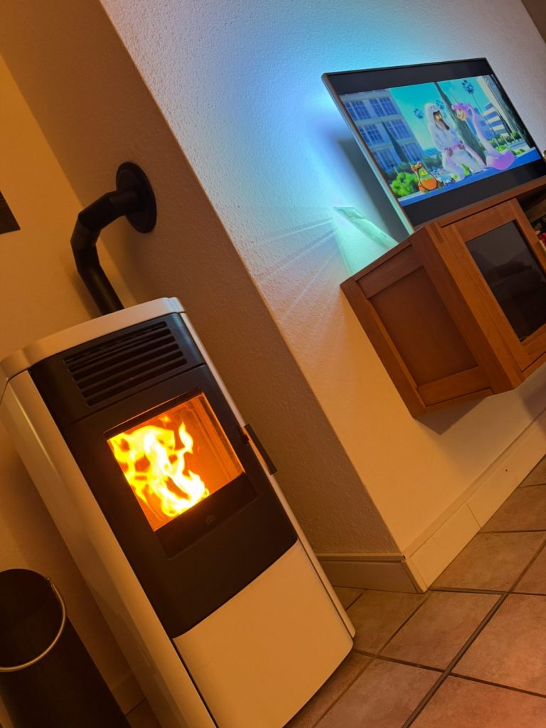 Ein heller großer Wohnbereich mit offener Küche und Pelletofen sorgt für eine gemütliche Atmosphäre.