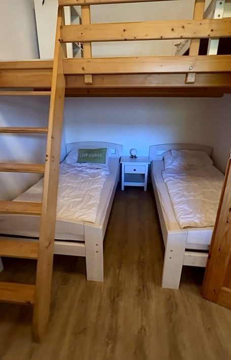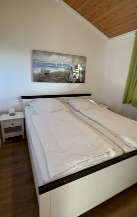 Ein gemütliches Schlafzimmer mit Doppelbett (1,80 x 2,00 m) und ein weiteres gemütliches Schlafzimmer/Kinderzimmer mit zwei Einzelbetten und einen Alkoven (erhöhter Spielbereich ) für Kinder. Alle Schlafräume sind mit Fliegengittern ausgestattet.