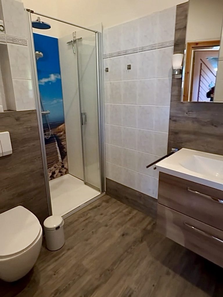 Das Bad verfügt über ein Dusche, WC und Waschbecken.